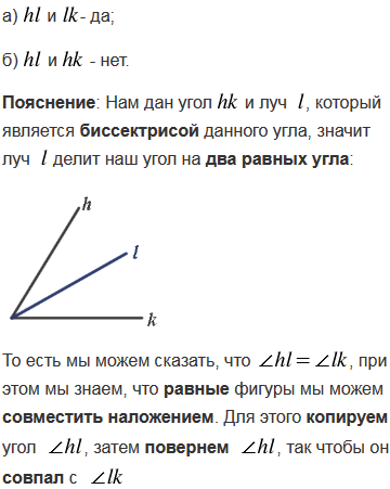 Луч l - биссектриса угла hk. Можно ли наложением совместить углы: а) hl и lk б) hl и hk?