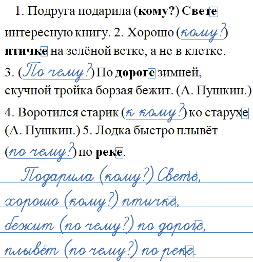 1. Подруга подарила (кому?) Свете интересную книгу. 2. Хорошо (кому?) птичке на зелёной ветке, а не в клетке. 3. (По чему?) По дороге зимней, скучной тройка борзая бежит. (А. Пушкин.) 4. Воротился старик (к кому?) ко старухе (А. Пушкин.) 5. Лодка быстро плывёт (по чему?) по реке.