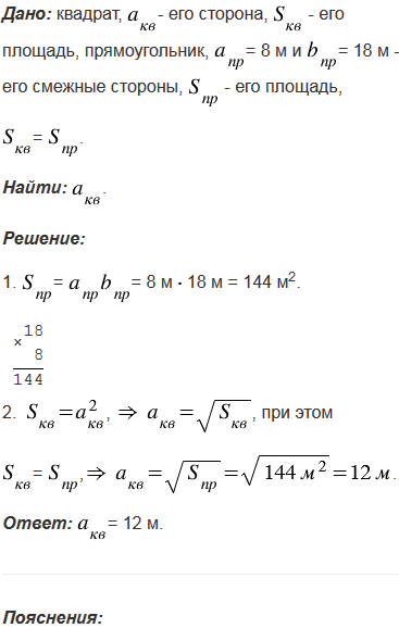 Найдите сторону квадрата, площадь которого равна площади прямоугольника со смежными сторонами 8 м и 18 м.
