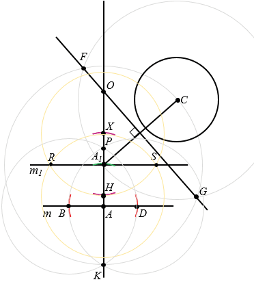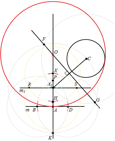 чертим две окружности с центрами в точках А1 и С радиуса А1С (полностью окружности строить необязательно, главное определяем их точки пересечения). Эти окружности пересекутся в двух точках F и G, проводим через эти точки прямую FG, которая пересечет прямую РК в точке О.