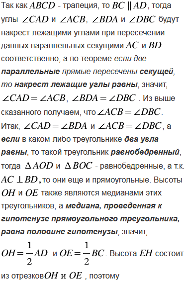 Диагонали равнобедренной трапеции взаимно перпендикулярны, а сумма оснований равна 2