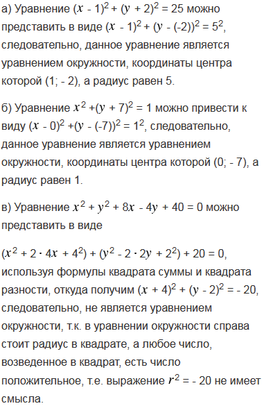 Выясните, какие из данных уравнений являются уравнениями окружности. Найдите координаты центра и радиус каждой окружности.