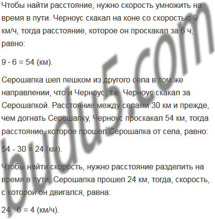Расстояние между селами Грушевое и Яблоневое равно 30 км. Из этих сел одновременно в одном направлении отправились казаки Серошапка и Черноус. Черноус скакал на коне со скоростью 9 км/ч и через 6 ч после начала движения догнал Серошапку, который шел пешком. С какой скоростью шел Серошапка?
