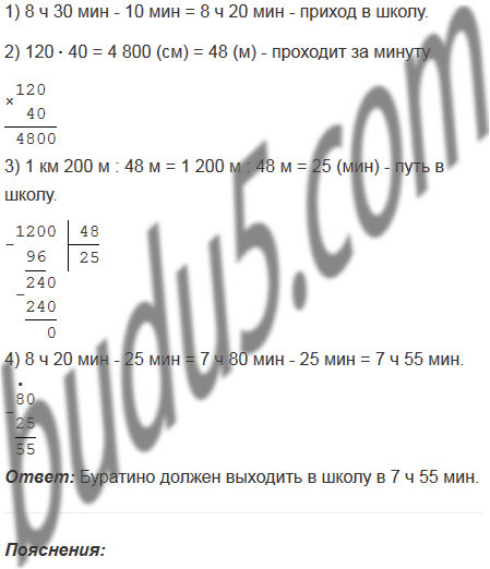 Буратино живет на расстоянии 1 км 200 м от школы. Уроки в школе начинаются в 8 ч 30 мин. Буратино делает за минуту 120 шагов, длина шага - 40 см. В котором часу Буратино должен выходить из дома, чтобы приходить в школу за 10 мин до начала занятий?