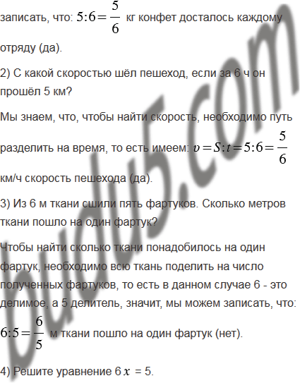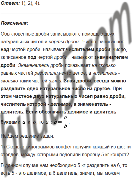 1) Сколько килограммов конфет получил каждый из шести отрядов, между которыми поделили поровну 5 кг конфет?