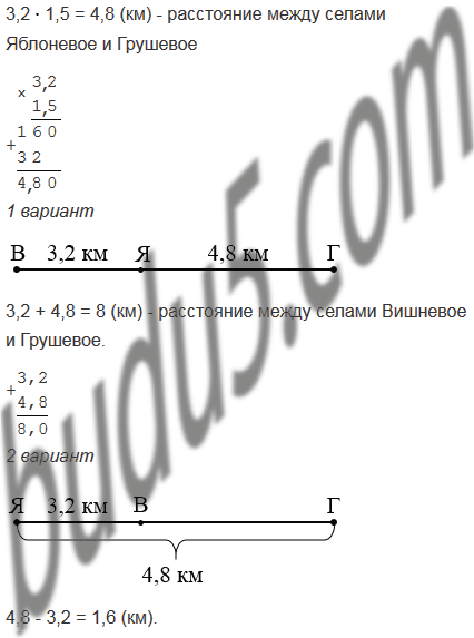 Прямолинейный участок шоссе проходит через села Вишневое, Яблоневое и Грушевое. Расстояние между селами Вишневое и Яблоневое равно 3,2 км, что в 1,5 раза меньше расстояния между селами Яблоневое и Грушевое. Найдите расстояние между селами Вишневое и Грушевое. Сколько решений имеет задача?