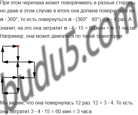 Черепаха ползёт по плоскости с постоянной скоростью, изменяя направление движения на 90° через каждые 15 мин. Докажите, что вернуться в точку "старта" она сможет только через целое количество часов после начала движения.