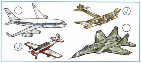 2. Найди на рисунке старинные самолёты и отметь их галочкой. Сравни старинные и современные самолёты. В чём их сходство, а в чём различия?