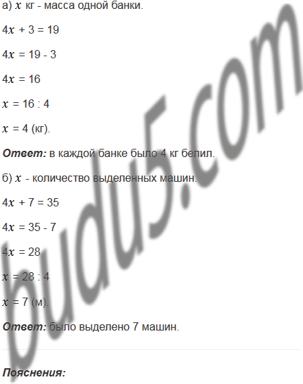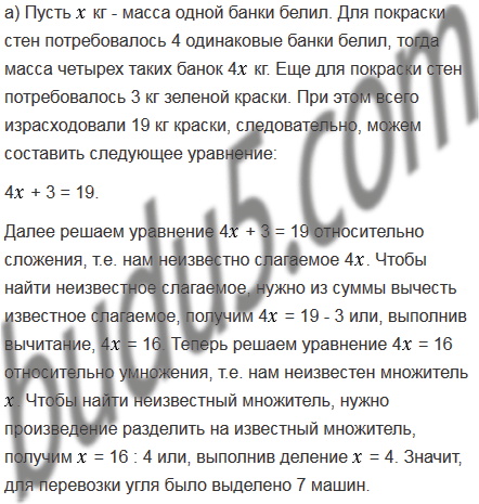 а) Для покраски стен потребовалось 4 одинаковые банки белил и еще 3 кг зеленой краски. Всего израсходовали 19 кг краски. Сколько килограммов белили было в каждой банке?