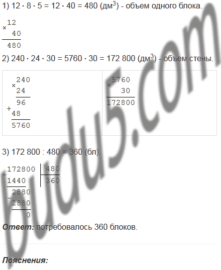 Бетонный блок имеет длину 12 дм, ширину 8 дм и высоту 5 дм. Из таких блоков сложили стену длиной 240 дм, шириной 24 дм и высотой 30 дм. Сколько блоков потребовалось для этого?