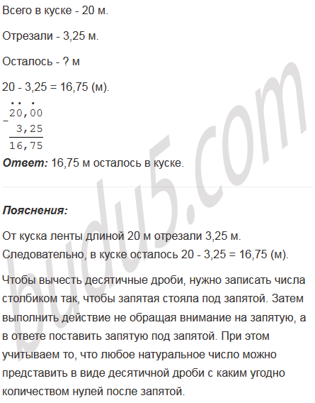 От куска ленты длиной 20 м отрезали 3,25 м. Сколько метров осталось в куске?