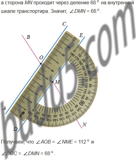 Измерьте углы АОВ, ВОС, DMN, NME (рис. 113). Какие из этих углов равны?