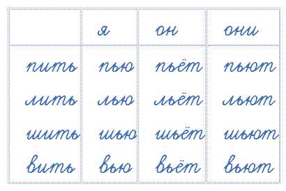 | пить лить шить вить | пью ... ... ... | пьёт ... ... ... | пьют ... .... ... |
