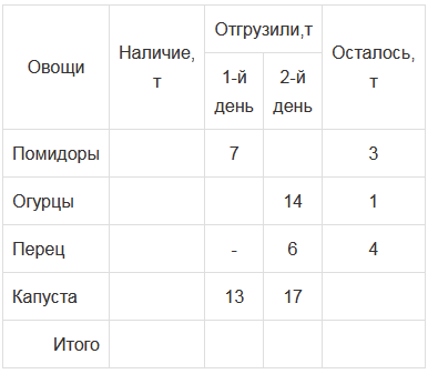2) На базе было 20 т огурцов. Во второй день отгрузили 14 т огурцов и осталась 1 т огурцов. Сколько тонн огурцов отгрузили в первый день?