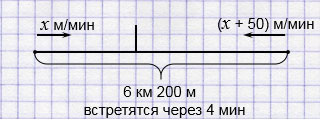 1) С двух станций метро навстречу друг другу движутся два поезда, и скорость одного из них на 50 м/мин меньше скорости другого. Сейчас расстояние между ними 6 км 200 м. Найдите скорость каждого поезда, если известно, что они прибудут на одну станцию через 4 мин.